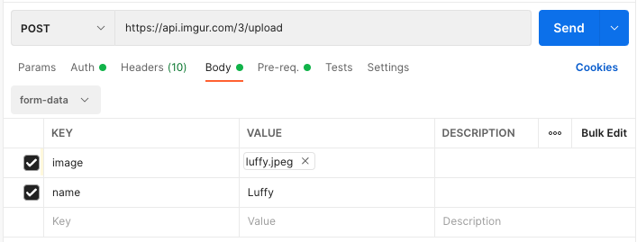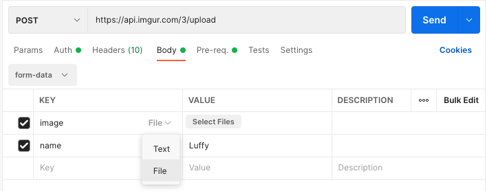 For this post, I will be using Imgur API (you are free to use any API that supports file upload). So here are the following things we need to successfully upload the file using Postman -