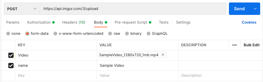 In this post, I will cover how to do file upload using Postman for both image and video. Postman makes it really easy to do file uploads with the help of form-data. Let's take a look at that -