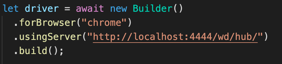 Now that we have our Docker part figured out, it's time to point our tests to run on port 4444. So this part will be specific to the framework/language that you are using in your Selenium script. In my case, I had to do the following update to point my tests to port 4444.