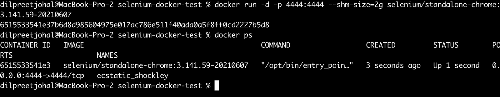 docker run -d -p 4444:4444 --shm-size=2g selenium/standalone-chrome:3.141.59-20210607